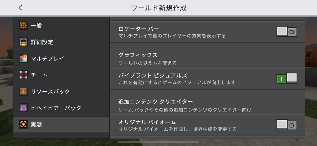 アップデートが完了したら、Vibrant Visualsを適用したいワールドの設定画面の「実験」タブに進み、