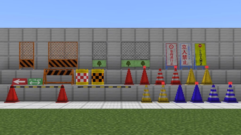 このアドオンは、マイクラ統合版に工事現場で見かけるオブジェを追加するアドオンです。カラーコーンから自由に配置可能なフェンスまで、様々な場所に設置して街を彩れるオブジェがそろっています。