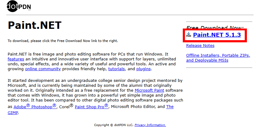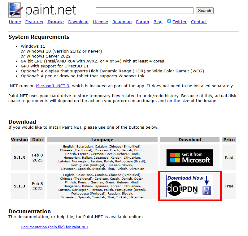 すると上のような画面に遷移するので、Download Now dotPDNを押下します。上のGet it from Microsoftは寄付項目なので、制作者に寄付を行いたい場合はこちらを選択します。