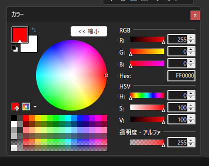 まずは鉛筆ツールです。左の画像の鉛筆マークを押すと、右のカラーパレットで選択した色で1pxずつ色を塗ることができます。これは、ピクセル単位の細かい絵を描くのに適しています。