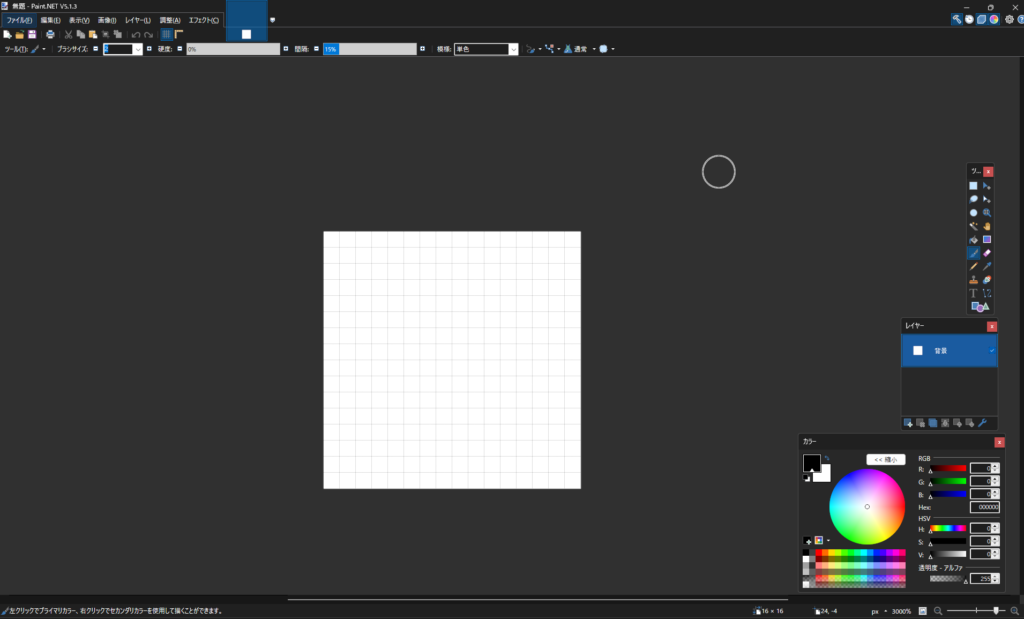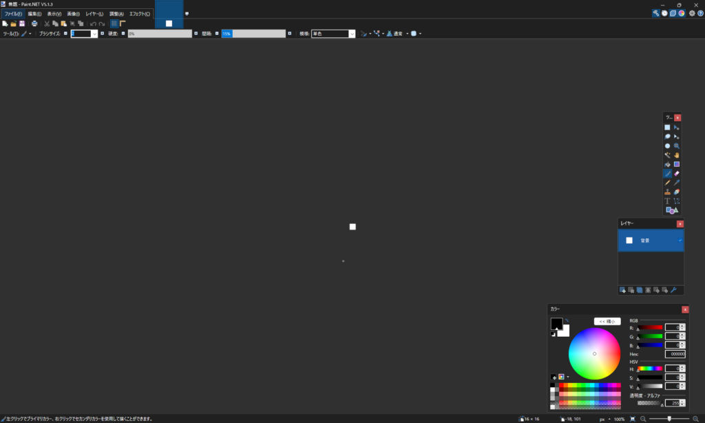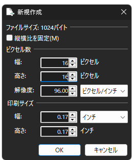 まずは16px四方の正方形のキャンバスを作成します。キャンバスとは、絵画でいう紙そのものです。紙を用意しないと絵は描けませんからね。