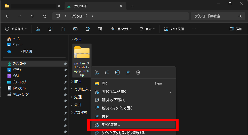 ダウンロードが完了したら、エクスプローラーからダウンロード先のフォルダを開きます。すると下のようなzipファイルがダウンロードされているので、右クリック→すべて展開を押します。