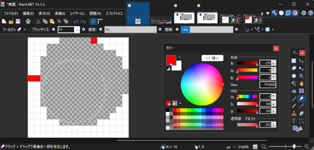 続いては消しゴムツールです。名前の通り消しゴムで、消した場所は透明なピクセルになります。消しゴムの大きさはブラシツールと同様左上の「ブラシサイズ」の項目で変更可能です。(消しゴムはブラシなのかというツッコミは禁止です。)