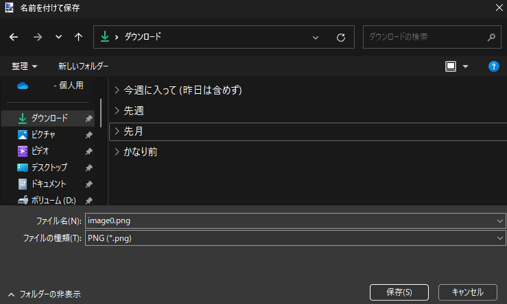 上のようにファイル名とファイルの種類を選択すれば保存は完了です。ファイルの種類は、マイクラのアドオンに使用する場合はPNGにしてください。