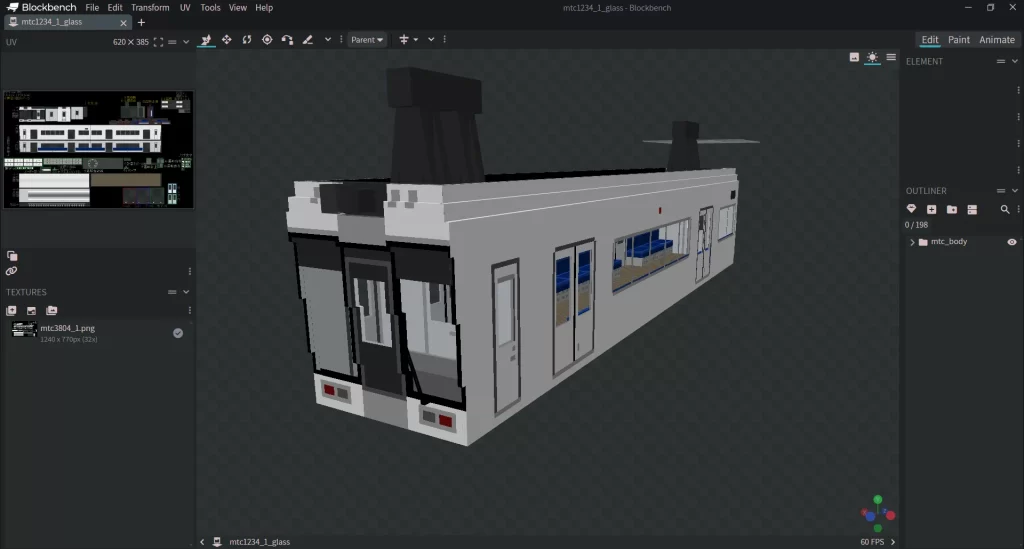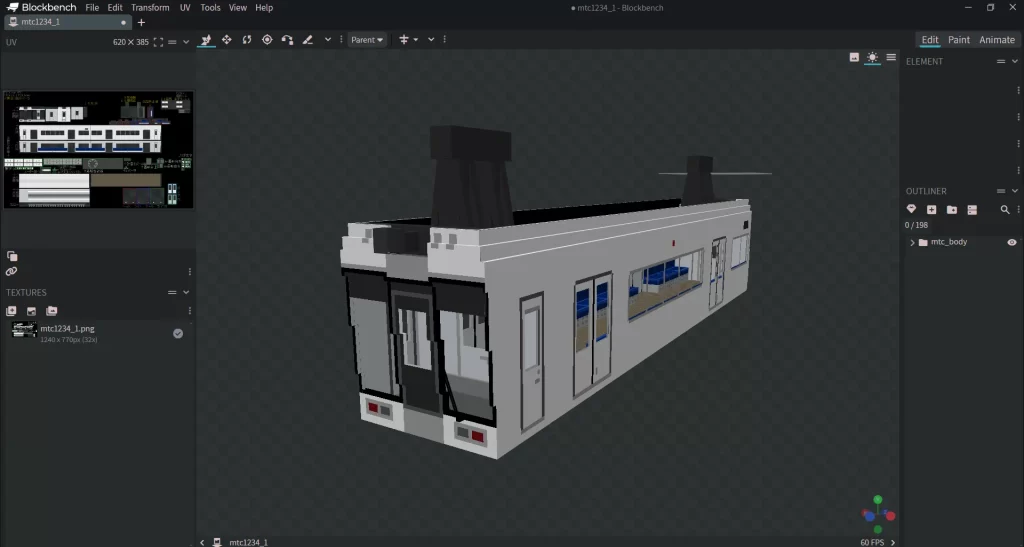 Blockbenchで開くと先頭車両の3Dモデルが表示されると思います。