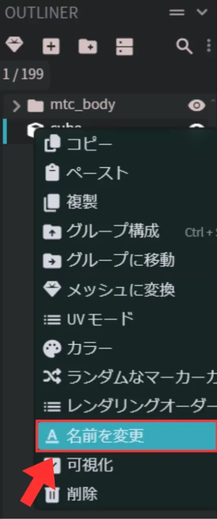 新しく追加されたキューブを右クリックして「名前を変更」を選択し、分かりやすいように「glass」と変更しておきましょう。