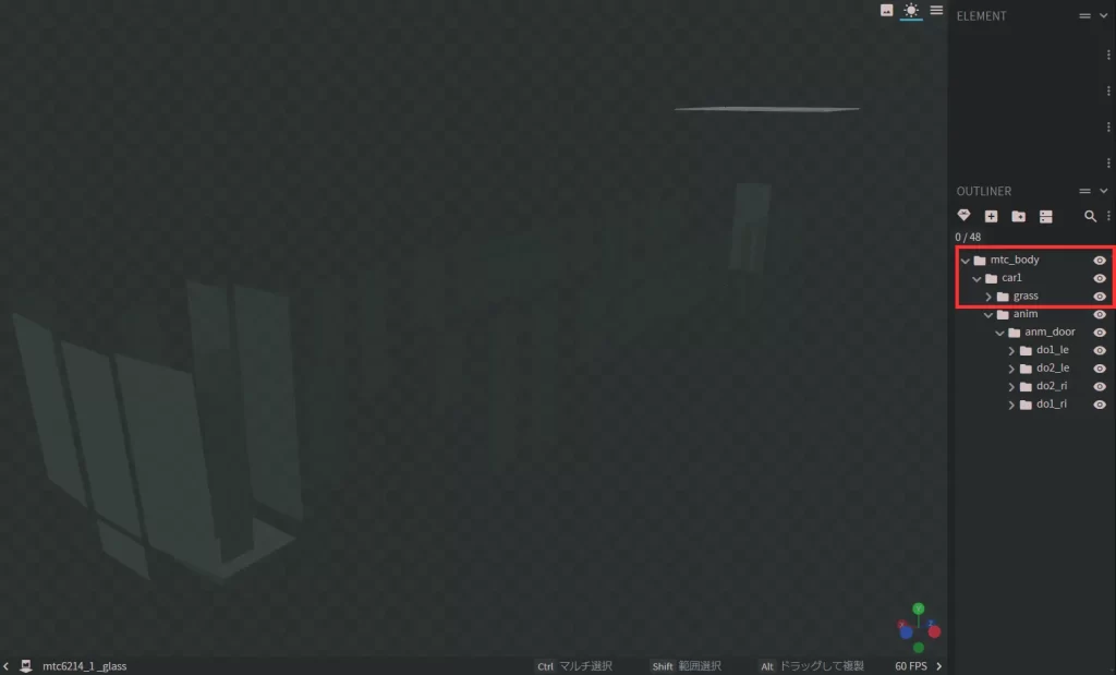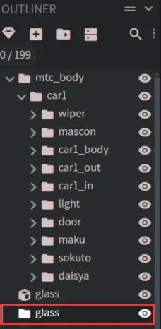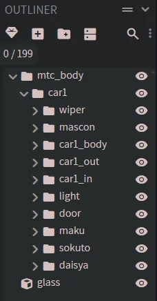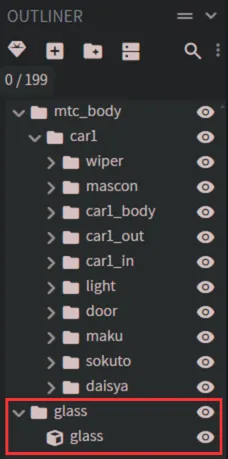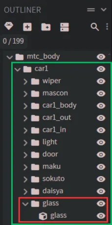 ※車両によってはcar1グループが無く、mtc_bodyグループ直下で各グループが配置されている場合もあります。その場合、glassグループをmtc_bodyグループにドラック&ドロップしてください。