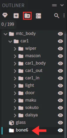 続いて、mtc_body→car1の順にグループを開いていき「+マークのフォルダアイコン」を押すとboneという名前で新しくグループが追加されます。