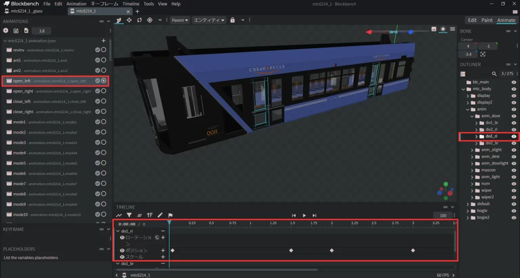 車両本体側のモデル、ガラス側のモデルからそれぞれopen_leftのアニメションを再生した際に、車両本体側のドアとガラス側のドアガラスが同じ動きをすれば成功です。
