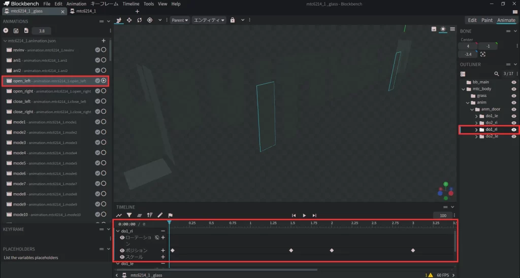 成功したら他のopen_rightやclose_leftなどの同じように設定していき、全てのガラスモデルにアニメーションを設定していきましょう。