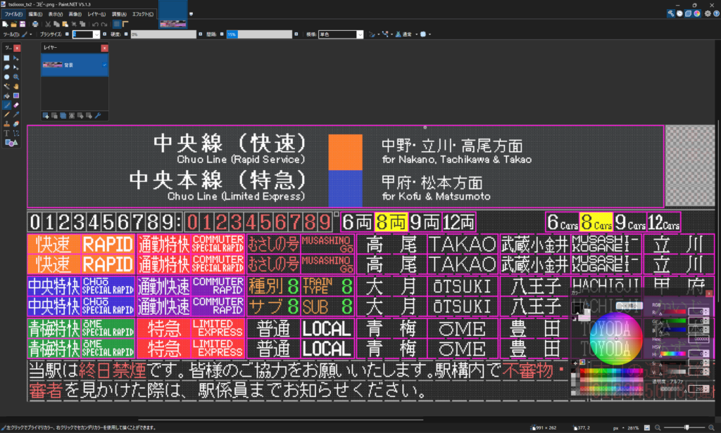 このページでは、槻嶋製作所発車標アドオンのカスタマイズ方法を解説しています。カスタマイズの前に、まずアドオン本体の使用方法をしっかり理解しておくことをお勧めします。使用方法はこちらのページからご覧いただけます。