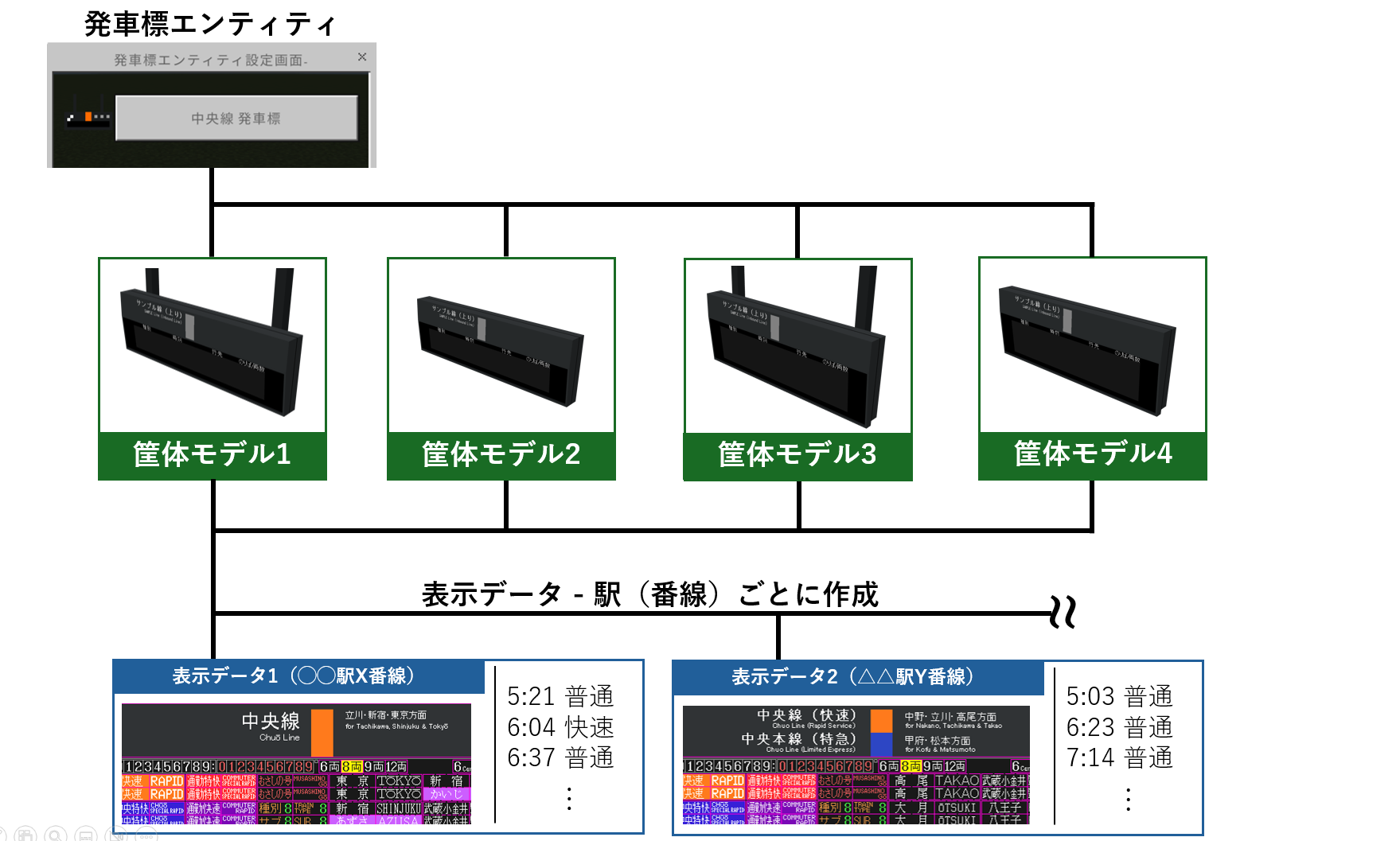 まず前提として、基本的にパック1つにつき追加される発車標エンティティは1体です。そして、追加されるエンティティ内には大きく分けてモデル(筐体)データと表示データの2種が存在しています。前者は発車標の筐体の形のデータ、後者はテクスチャと、列車の時刻情報などのデータです。