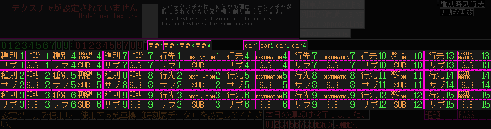 これらの情報のうち、時刻はただの数字のためテクスチャを編集する必要はありません。種別、行先、両数は「種別1」~「種別9」、「行先1」~「行先15」といった具合に番号で区別され、どの番号にどのテクスチャを設定したかが非常に重要になります。