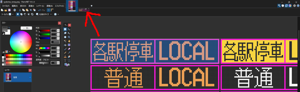 テクスチャの作成が完了したら、半透明処理を施していきます。半透明処理とはテクスチャの一部のアルファ値(=透明度)を下げることを指します。このアドオンではテクスチャの半透明の部分がゲーム内で発光するようになっているため、この処理を施すことで発車標の文字を光らせることが可能です。