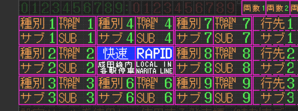 上の画像は少しわかりづらいですが、両数1~4の枠が日本語、英語それぞれ上部に、下部左寄りに種別1~9が、右寄りに行先1~15がそれぞれ日本語、英語、サブ日本語、サブ英語の4つセットで位置しています。※行先の枠は種別の枠より広くなっています。