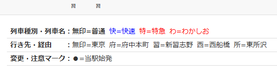 それではテクスチャを作成していきましょう。まず、時刻表に乗っているすべての種類の種別、行先、両数の情報を描いていきます。海浜幕張駅の上りは、種別が「各駅停車」「快速」「特急」の3種、行先が「東京」「府中本町」「新習志野」「西船橋」「東所沢」の5種、両数はここに乗っていませんが、「10両」「8両」「5両」の3種があります。