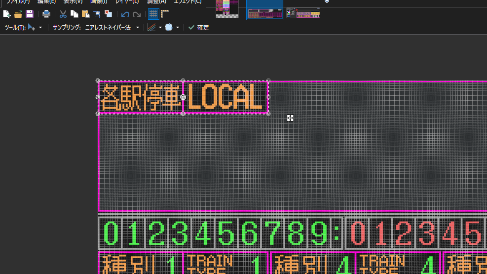 例えば上の画像のようにテクスチャを描いた場合、発車標で「種別5」を表示すると、「快速」→「成田線内各駅停車」→「RAPID」→「LOCAL IN NARITA LINE」→「快速」…の順に3秒ごとに自動で表示が切り替わっていきます。途中で表示を切り替えない場合は、下のように上下で同じ表示を設定してください。