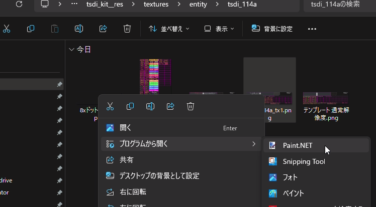 まずは表示データ1(海浜幕張駅上り)用のテクスチャを描いていきます。表示データ1用のテクスチャは、tsdi_xxxx_tx1.pngです。ご覧のように1のみ最初から入っているので、これを編集していきます。ファイルを右クリックして、プログラムから開く→Paint.NETを選択して開きます。
