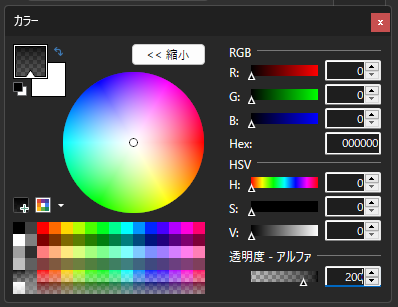 次にカラーパレットの詳細を開き、右下の「透明度 – アルファ」の数字を200程度に設定します。
